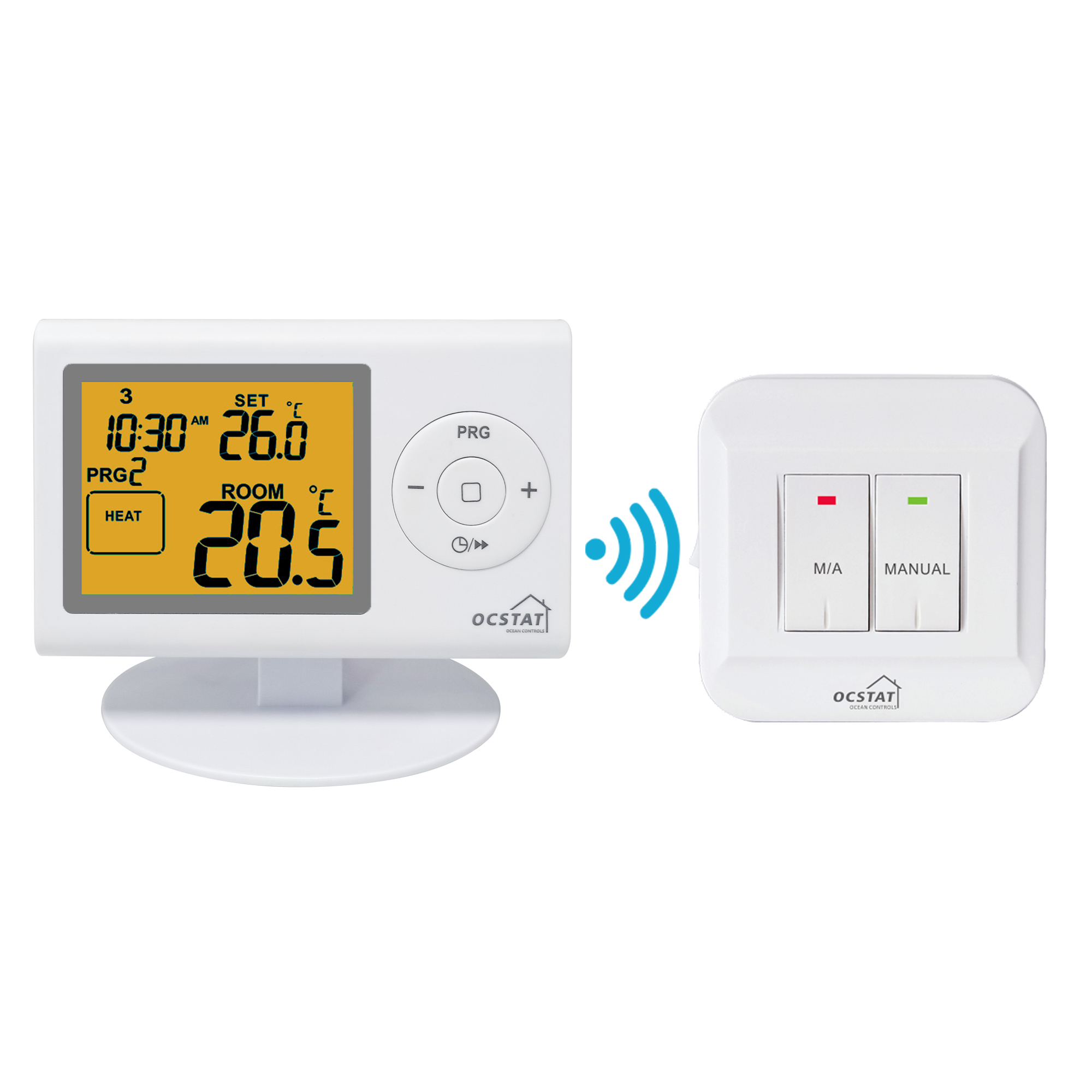 O1: Termostat pokojowy RF jest marki OCSTAT, a numer modelu to ST2402RF.